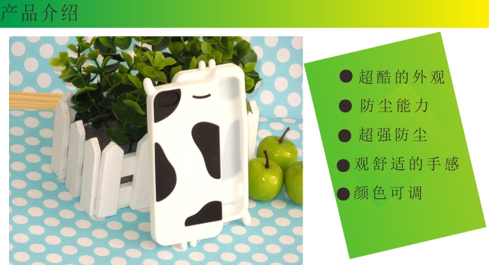 • 可愛的奶牛硅膠手機(jī)套 1.多色硅膠手機(jī)套采用優(yōu)質(zhì)進(jìn)口材質(zhì)制成,無毒無副作用,無塵車間生產(chǎn),質(zhì)地柔軟,手感極好,可用水清洗。加厚處理及有線條感,不小心跌落時(shí)有很好的緩沖作用,可以很好的保護(hù)您的愛機(jī)不受損壞。 2.重量適度、防滑性好。 3.具有很強(qiáng)的耐磨性,與各種接觸面接觸,具有較強(qiáng)的粘附性,就算在加大的傾斜角面,也不滑動(dòng)。 4.可反復(fù)清洗,永保外觀亮麗如新。 5.采用硅膠材質(zhì)經(jīng)精密加工,專業(yè)型號(hào)制作手機(jī)套的貼身保護(hù)使者。 6.多種顏色供挑選:大紅色、粉紅色、白色、黑色、天蘭色、綠色、紫色等。